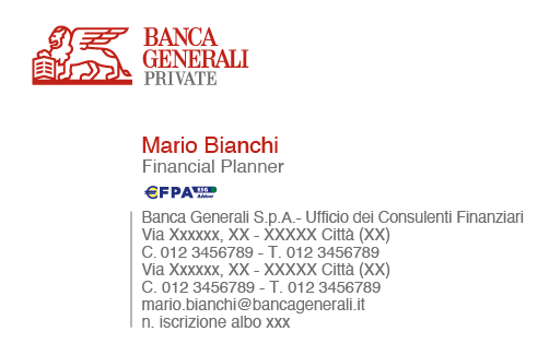 Biglietto da visita classico F.to cm. 8,5x5,5 con marchio Banca Generali Private e marchio EFPA ESG,stampato su carta riciclata FSC Shiro Echo Bianco Brillante gr. 350.Questa versione prevede la possibilità di inserire 2 righe aggiuntive per un secondo indirizzo con relativi recapiti telefonici.Stampa a 4 colori in digitale su un solo latoImballo: pacco termo da 200pz.