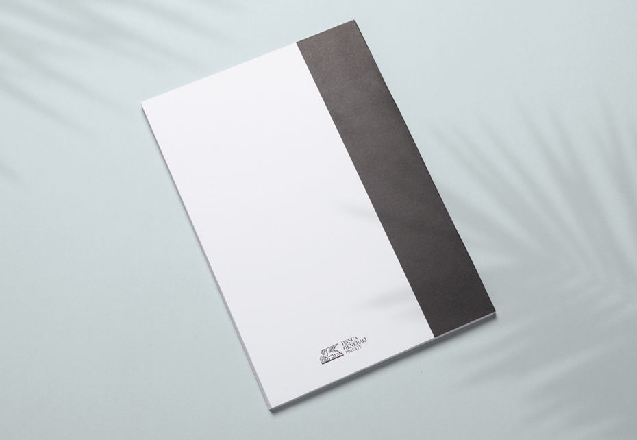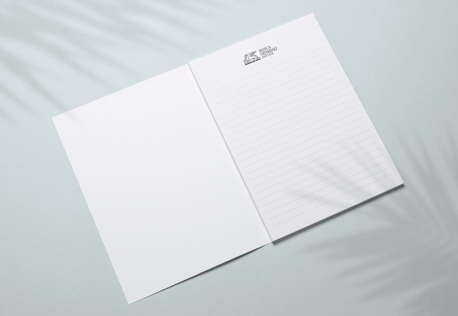 Elegante blocco formato A4 completamente in carta riciclata FSC, con marchio Banca Generali Private a colori in copertina. All’interno 50 schede incollate in testa con marchio Banca Generali Private in nero posizionato centrato in alto e comode righe per scrivere in maniera ordinata.